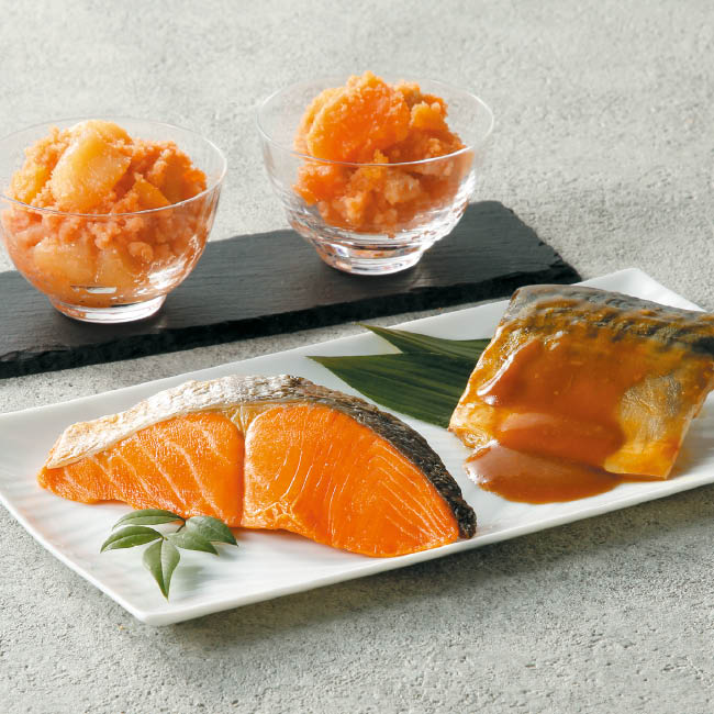 黄金明太漬けサーモン130g、黄金明太漬けほたて130g、紅鮭塩焼(40g)1切入り×2、鯖味噌煮(70g)1切入り×2