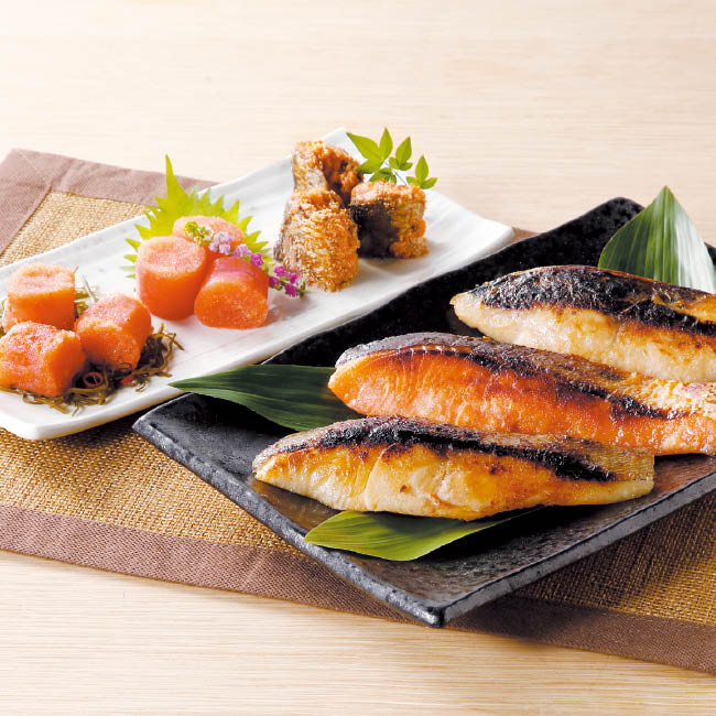沖目鯛 1切れ、寒さわら 1切れ、銀さけ 1切れ、昆布明太子 200g、味付けたらこ 200g、いわし明太 2尾