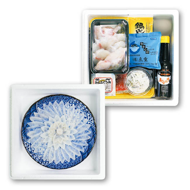 とらふぐ刺し24cm(100g)、とらふぐちり(300g)、とらふく皮(50g)、とらふく干しヒレ5枚×1、ぽん酢150ml×1、もみじおろし16g×2、鍋だしの素60g(希釈タイプ)×2(とらふぐ/国産養殖)