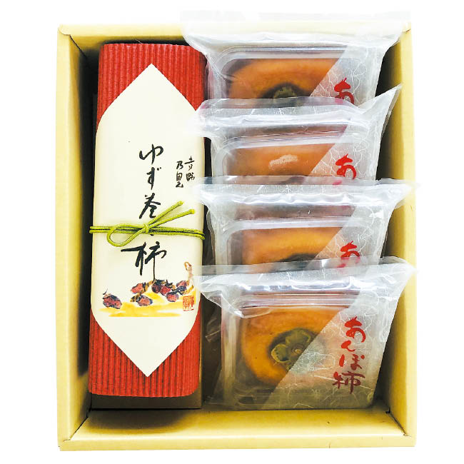 表面だけを乾かした柔らかい干柿『あんぽ柿』と寒風で干し上げた中にゆずピールを入れた『ゆず巻き柿』2つの干柿を楽しんでいただけるセットです。