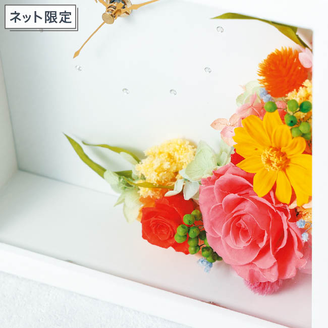 時を刻む、ありがとうの気持ち。日本メーカーの時計を使用し、品質と美しさを両立したプリザーブドフラワーです。