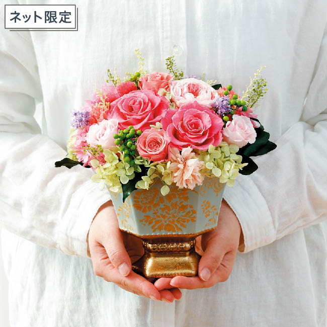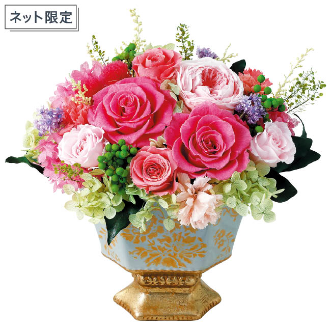 金彩模様の器に上品な彩を添えた豪華なプリザーブドフラワーです。
