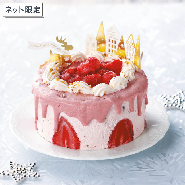 イタリア発祥のアイスデザート「カッサータ」をクリスマスケーキにアレンジしました。生クリームを合わせたクリームチーズ生地にラム酒漬けのドライフルーツやナッツを混ぜ込むことで食感のアクセントとなり、最後まで飽きることなくお楽しみいただけます。濃厚な甘みと甘酸っぱくスッキリとしたいちごのコンフィチュールをたっぷり乗せて仕上げた、色鮮やかなアイスケーキです。