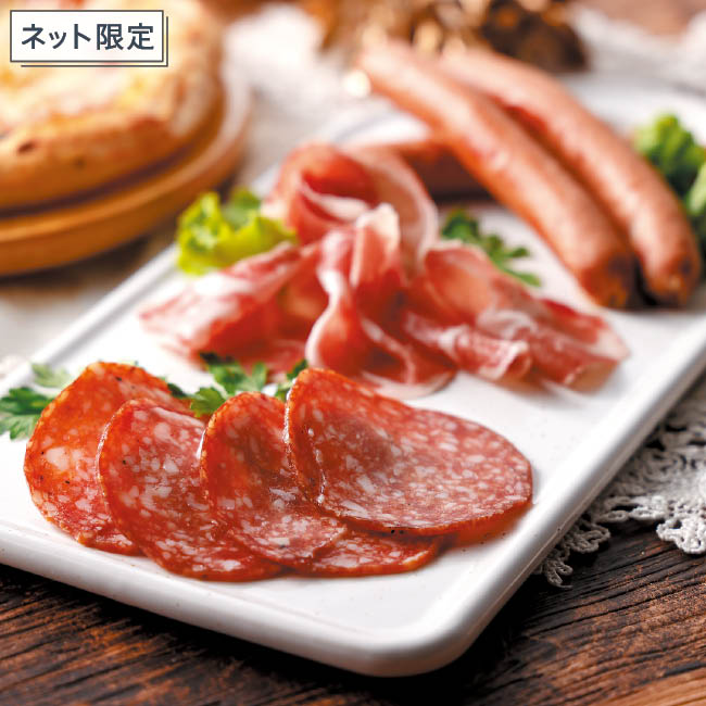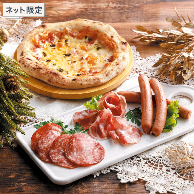 イタリア産の小麦粉を使用した自家製生地で作る本格ピザとこだわりハム・ソーセージのセットです。生ハムやサラミは贅沢にピザのトッピングとしてもお楽しみいただけます。