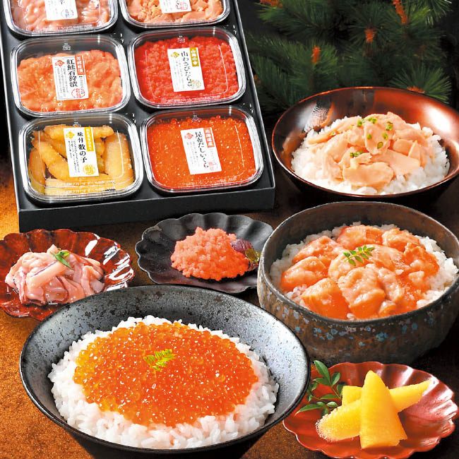 昆布だし秋鮭ほぐし70g、昆布だし秋鮭いくら醤油漬50g、味付け数の子70g、木樽熟成いか塩辛50g、山わさびたらこ50g、紅鮭石狩漬80g