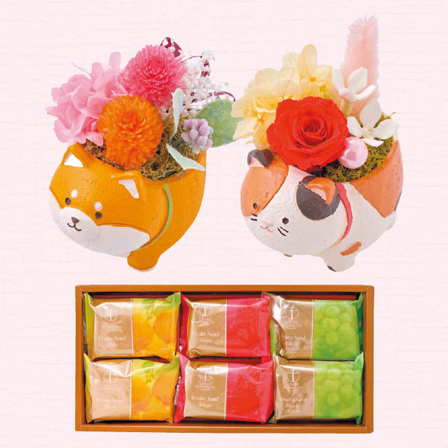 銀座フルーツサンド(マスカットレーズン・いちご・柚子)×各2、三毛猫(プリザーブドフラワー(バラ・アジサイ)、造花、樹脂製器)、柴犬(プリザーブドフラワー(千日紅・アジサイ・カスミソウ)、造花、樹脂製器)、お手入れのしおり (花サイズ:(三毛猫)幅約6cm×奥行約7cm×高さ約8.5cm (柴犬)幅約5.5cm×奥行約8cm×高さ約8cm) ※メッセージカード付(Thank you 日頃の感謝の気持ちを込めて)