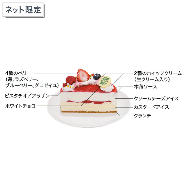 木苺のソースに4種のベリーとクリームをトッピングした華やかなアイスケーキ。カスタードアイスとクリームチーズアイスの二層仕立て。アイスの下にはクランチが敷き詰められ、食感も楽しめます。