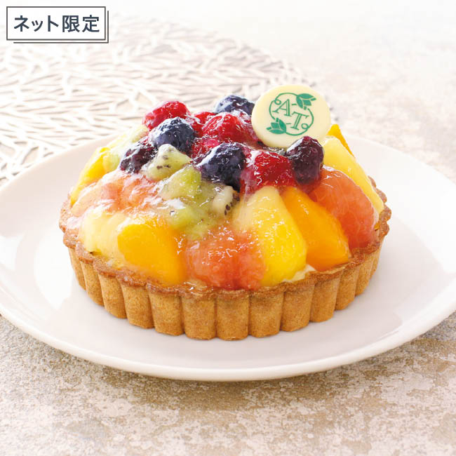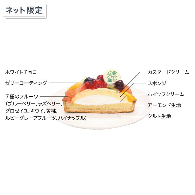 いろとりどりのフルーツを使った華やかなタルトケーキ。アーモンド生地のタルトに2種類のクリームとスポンジを重ね7種類のフルーツを飾り付けました。