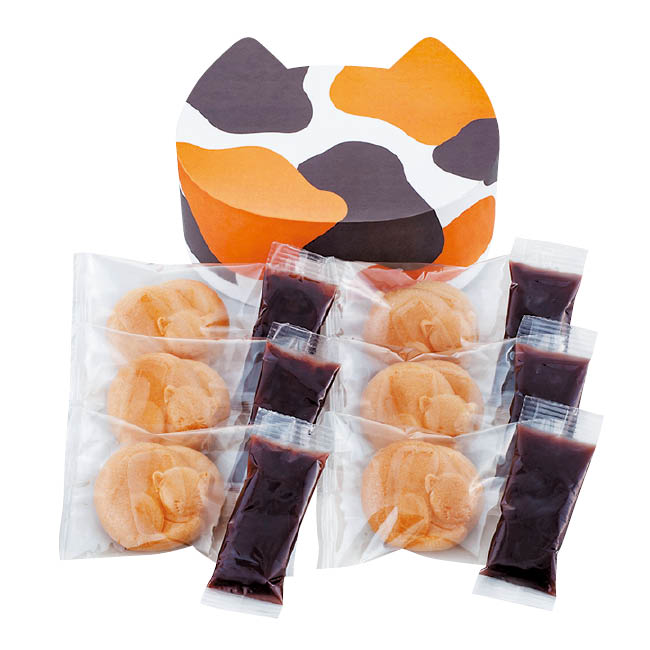 京の町でのんびりする可愛い三毛猫をイメージした最中皮に、別添の餡を詰めてお楽しみください。餡を詰めるちょっとした手作り感も楽しみながら、おやつ時間を楽しく演出できる一品です。