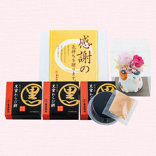 北海道産黒豆と黒蜜を使ったわらび餅とかわいい三毛猫のポットに入ったプリザーブドフラワーをセットにしました。わらび餅は一人前にちょうど良いサイズで、つるんとした食感が特徴です。きな粉をかけてお召し上がりください。
