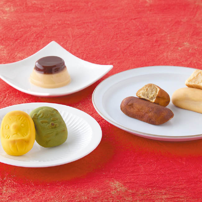 可愛らしいだるまと獅子舞をかたどったお饅頭に餡プリン等人気商品を詰め合わせました。