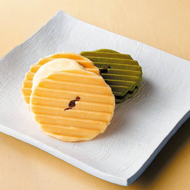 やさしい甘みのバニラ風味のクリームを挟んだ洋風せんべいと抹茶風味の詰合せ。