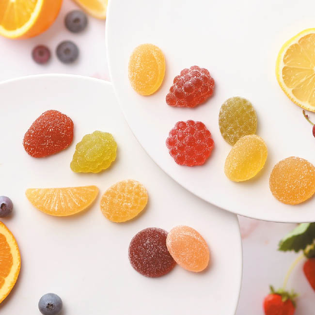 恵みのしずく(レモン・マスカット・グレープ・メロン・パイン・りんご×各6、ブルーベリー・いちご・クランベリー・オレンジ・マンゴー・ピーチ×各5)