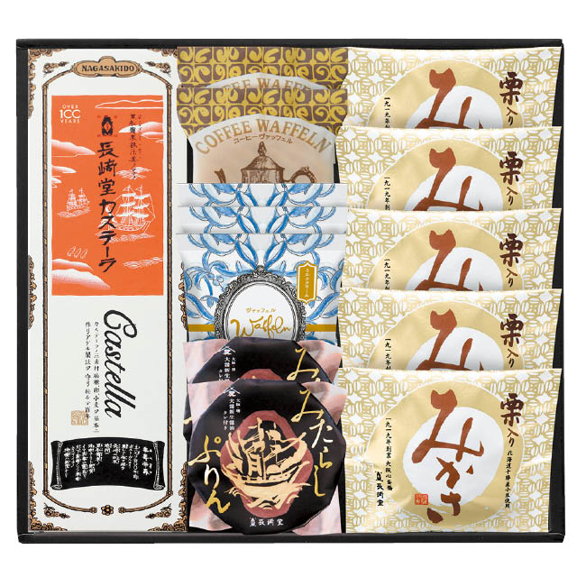 長﨑堂伝統のカステーラをはじめ、みたらしぷりん、どら焼きなど詰合せたバラエティー豊かなギフト。