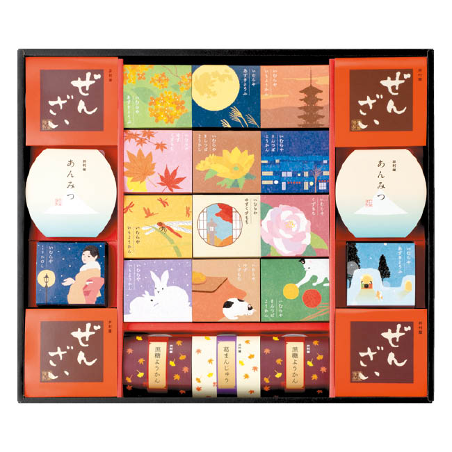 栗かのこ、くずもち(黒みつ・きな粉付)、くずまんじゅう各1コ、あんみつ、黒糖ようかん×各2コ、きんつばようかん、芋ようかん、柚子くずもち、あずきとうふ各3コ、ぜんざい4コ、合計10種類23コ