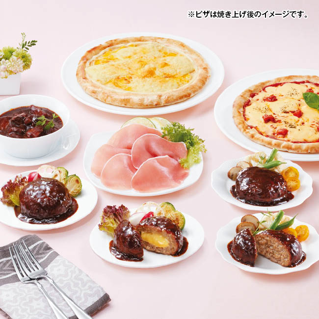 ピザ4種のチーズスペシャリテ260g、ピザマルゲリータスペシャリテ270g、生ハムスライス45g、デミグラスソースハンバーグ120g×2、デミグラスソースチーズ入りハンバーグ120g×2、ビーフシチュー180g