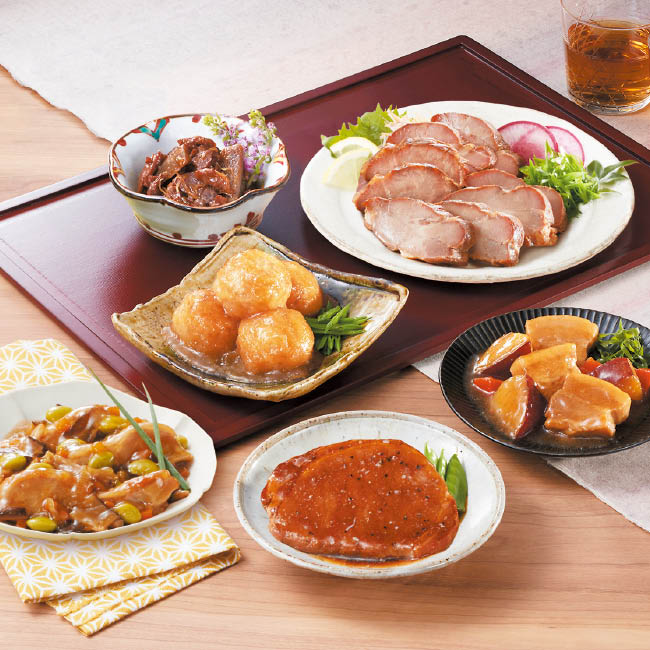 香味叉焼180g、つくねの蕪みぞれ仕立て180g、牛しぐれ煮ごぼう55g、鶏肉と野菜の炊き合わせ150g、豚肉とさつま芋の甘辛煮150g、豚ロースの醤油煮込み70g