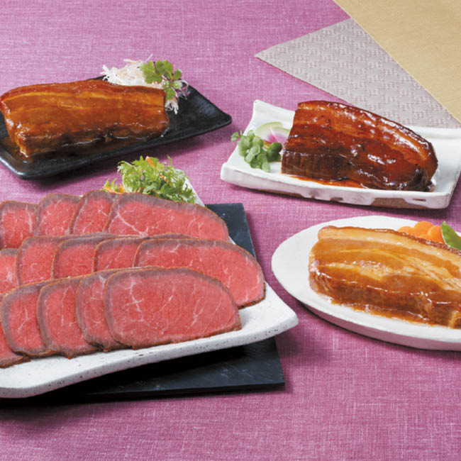 ローストビーフ(もも)210g、ローストビーフソース和風ゆず風味30g×2、豚角煮だし仕立て130g、豚角煮香味醤油仕立て130g、豚角煮味噌仕立て130g