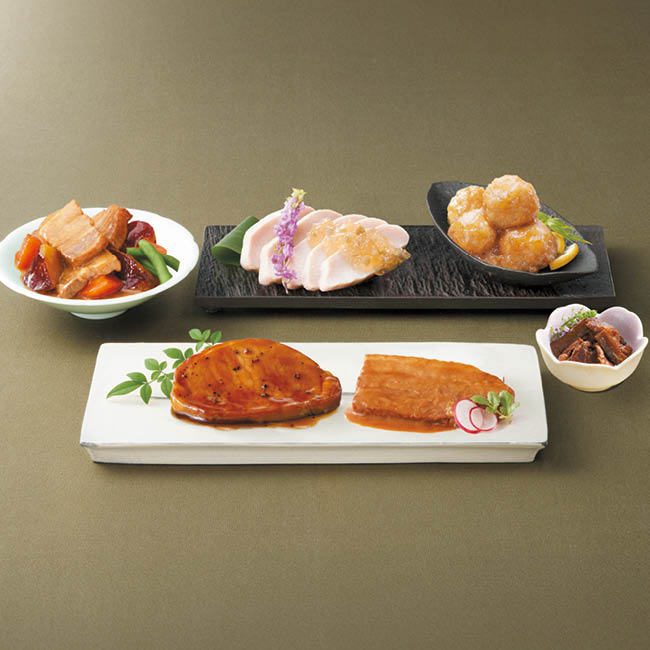 牛しぐれ煮ごぼう55g、豚肉とさつま芋の甘辛煮150g、蒸し鶏の梅ジュレ仕立て150g、豚ロースの醤油煮込み70g、豚ばらの味噌煮込み70g、つくねの蕪みぞれ仕立て180g