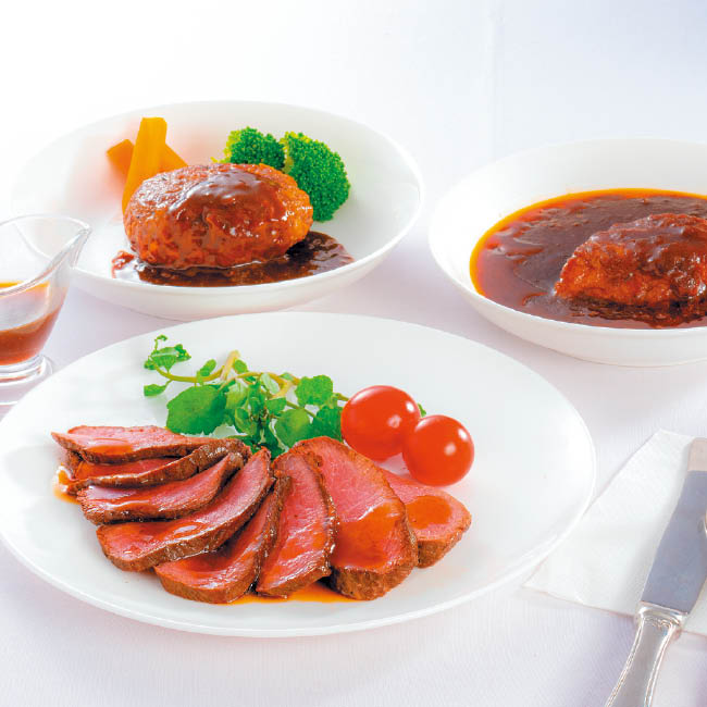 直火焼ローストビーフ160g(グレービーソース付)、赤ワイン&地ビール仕込みのビーフシチュー170g×2、ハンバーグ130g×2、洋風デミグラスソース40g×2