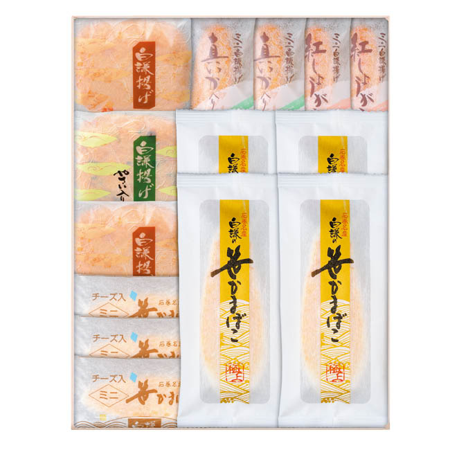 極上笹かまぼこ×7枚、白謙揚げ×3枚、野菜揚げ×3枚、ミニ真いか揚げ×3枚、ミニ紅生姜揚げ×3枚、チーズ入りミニ笹×3枚
