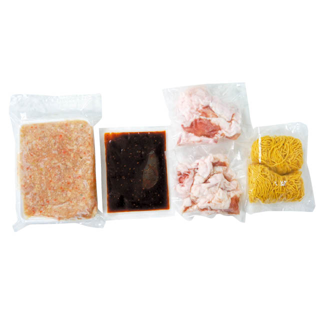 牛モツ(シマチョウ)200g×2、鶏ツミレ500g×1、ユッケジャン鍋のもと150g×1、ラーメン120g×2