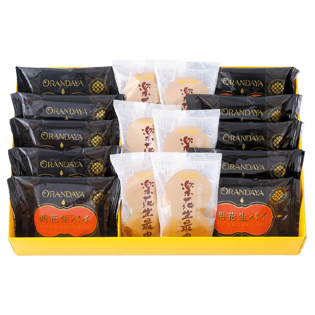 千葉県産落花生100%。落花生の蜜煮入り特製餡をパイ生地で包んだ「楽花生パイ」と、お米の風味豊かな最中皮で包んだ「楽花生最中」の詰め合わせです。