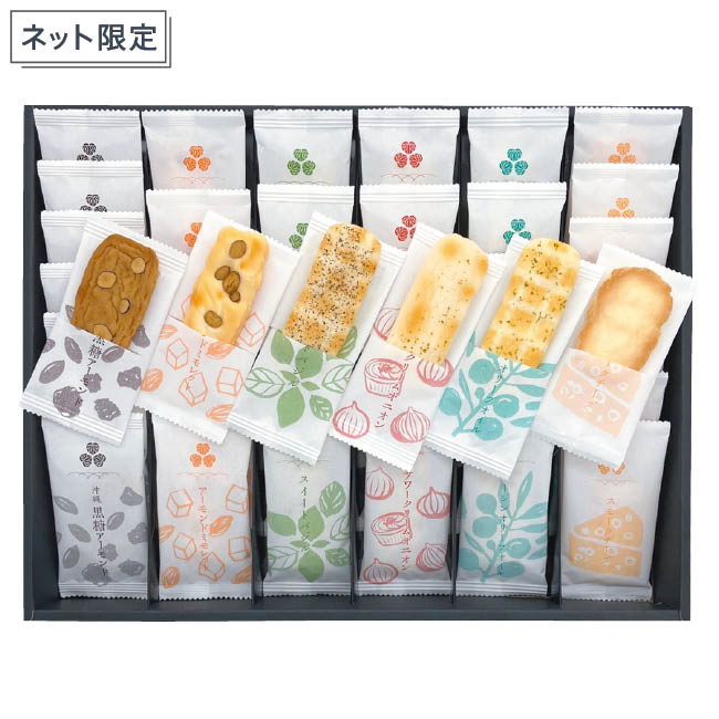 バージンオリーブオイル・スイートバジル・サワークリームオニオン・アーモンドミモレット×各6袋、沖縄黒糖アーモンド・スモークチーズ各8袋 計40袋
