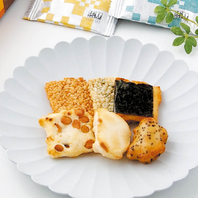 ひとくち慶長(醤油12枚、青海苔12枚)ひとくち(豆柿10枚、海苔巻10枚)、古乃端(海老12粒、胡麻12粒)