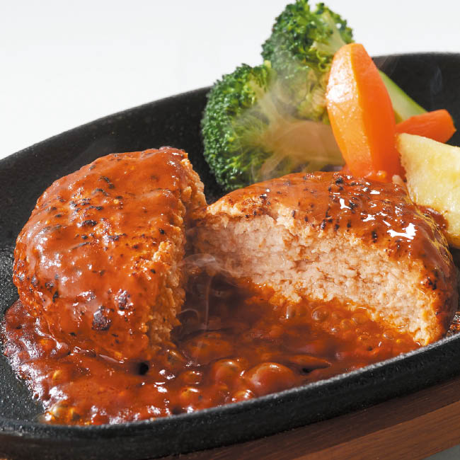 お米入りの飼料で、甘く旨みたっぷりに育った平田牧場金華豚の絶品ハンバーグ 玉ねぎをふんだんに使用した醤油仕立ての和風ソースと深い味わいのデミグラスソースをお楽しみいただけます。
