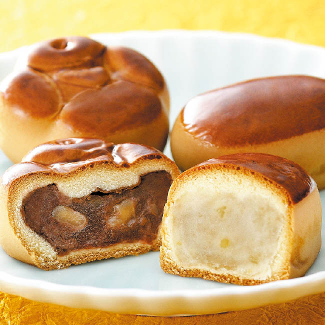 文明堂のカステラ1A号1コ、くるみ饅頭2コ、栗饅頭3コ、銀座プリン3コ