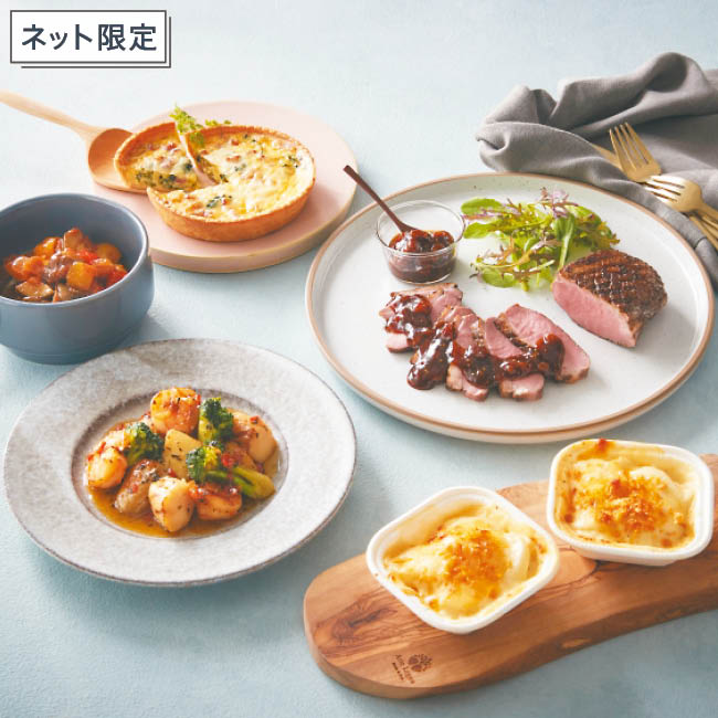 ドフィノワ じゃがいもグラタン 2個入り 200g×1P、野菜たっぷり200g分使用 おいしいラタトゥイユ 180g×1P、ベーコンとほうれん草のフロマージュキッシュ 160g×1P、北海道産帆立と海老のハーブグリル 150g×1P、合鴨のロースト いちじく&バルサミコソース 220g×1P