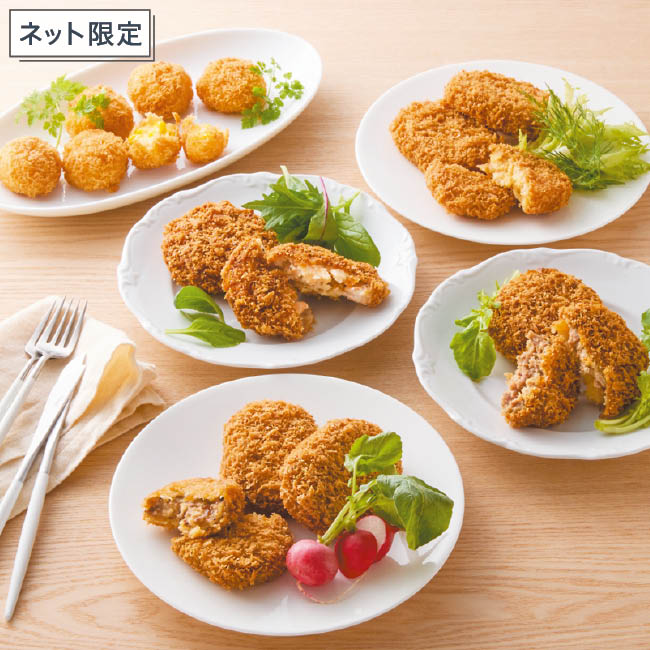 北海道産とうもろこしのプチクリームコロッケ6個入り180g×1P、海老と帆立のカツ2個入り140g×1P、ジューシーミンチカツ2個入り150g×1P、旨みに感動 ビーフコロッケ3個入り180g×1P、シンプルなじゃがいもコロッケ3個入り195g×1P