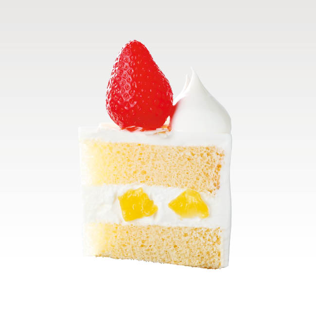 ピーチをサンドしたなめらかでくちどけの良いホイップクリームケーキに、削りホワイトチョコを上部にトッピングしました。
