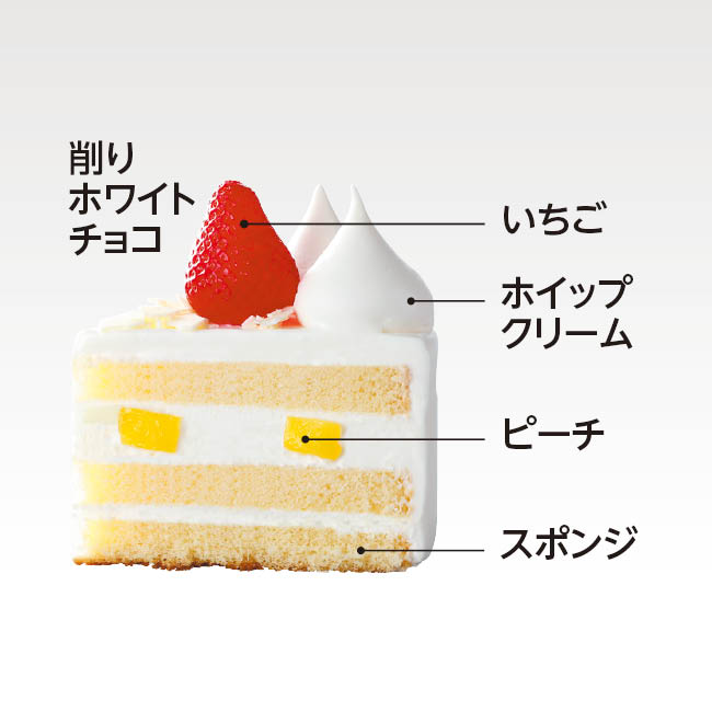 ピーチをサンドしたなめらかでくちどけの良いホイップクリームケーキに、削りホワイトチョコを上部にトッピングしました。