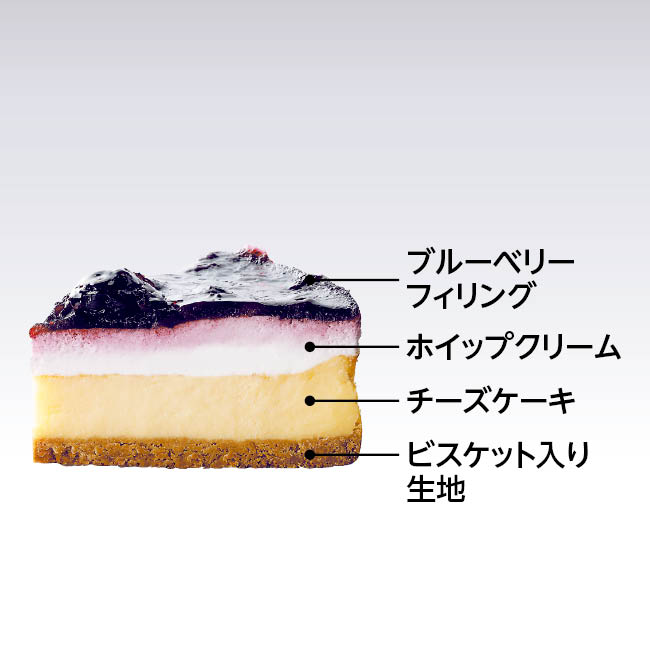 濃厚なチーズケーキの上にホイップクリーム、甘酸っぱいブルーベリーフィリングを重ねました。層によって異なる味・食感をお楽しみいただけます。