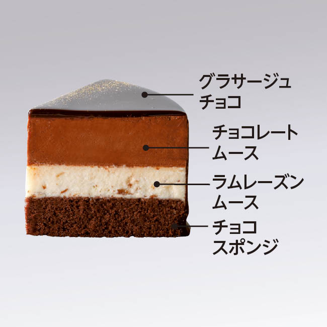 ベルギー産クーベルチュールチョコを使用したチョコムースをラムレーズン入りのムースに重ね、全体を重厚感のあるグラサージュチョコで仕上げました。ラムレーズンの芳醇な香りと濃厚なチョコムースが相性抜群です。