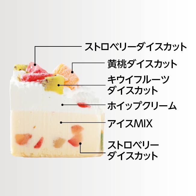 アイスケーキ。苺のダイス果肉が入ったミルクアイスに色とりどりの果実をトッピング。