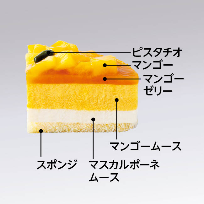 スポンジにマスカルポーネムース、マンゴームースと重ね上げ、天面にマンゴーゼリーを流しました。更に贅沢にマンゴーの果肉をたっぷりと散りばめ仕上げました。