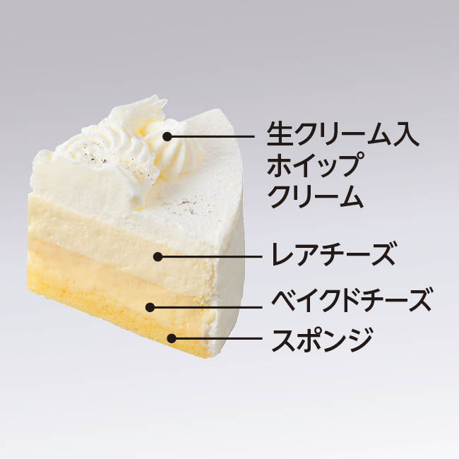 ベイクドチーズとレアチーズを重ねた2種類のチーズ生地で、食感や口どけを同時に楽しめるクリスマスデコレーションケーキです。