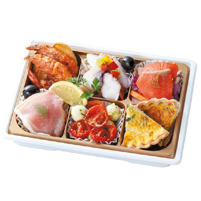 皮つきポテト、ガーリックシュリンプ、たこマリネ、サーモンマリネ、生ハムチーズポテサラ、カプレーゼ、ほうれん草とベーコンのキッシュ 2~3人前 トレーサイズ:280×179mm