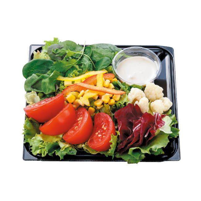 トマト、レタス、カリフラワー、コーン、グリーンリーフ、サニーレタス、ベビーリーフ、トレビス、パプリカ(赤・黄)、シーザードレッシング トレーサイズ:197×197mm