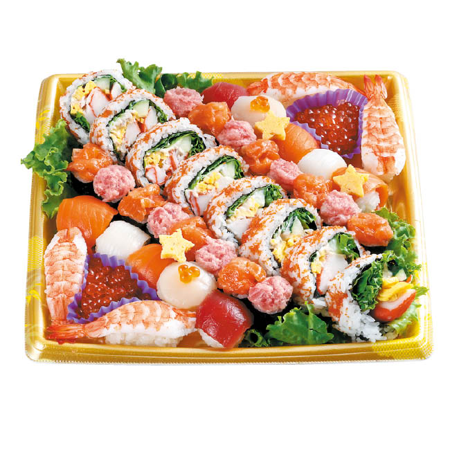 たっぷりいくら付き! お好きなお寿司にトッピングしてさらに美味しい! サラダ太巻(カニカマ・ツナマヨ・玉子・ほぐし数の子・きゅうり・グリーンリーフ)・かっぱ巻(サーモンたたき・まぐろたたきのせ)・てまり寿司(ほたて・まぐろ・サーモン・いか)・蒸し海老握り・いくら 3~4人前 トレーサイズ:270×270mm