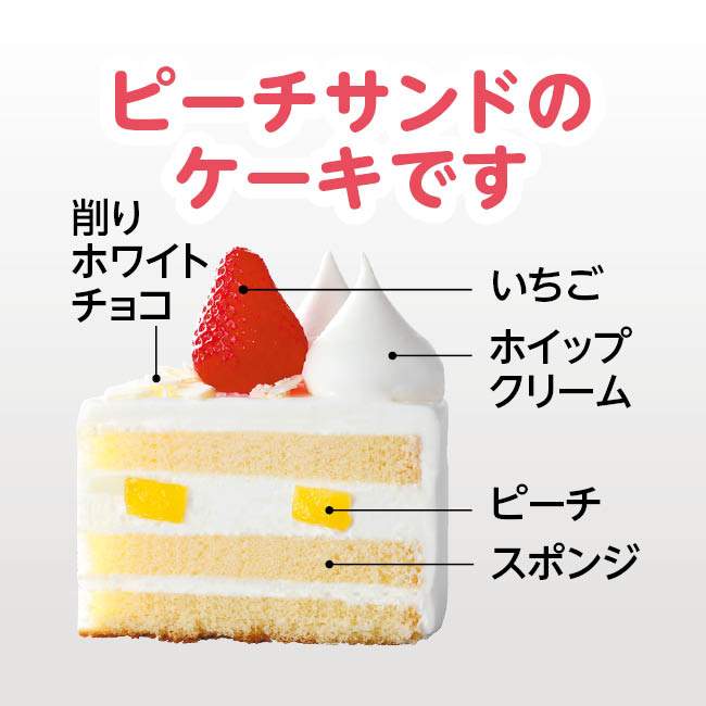 ピーチをサンドしたなめらかでくちどけの良いホイップクリームケーキに削りホワイトチョコを上部にトッピングしました。 直径約15cm 別添苺4コ ※ロウソクはついておりません。