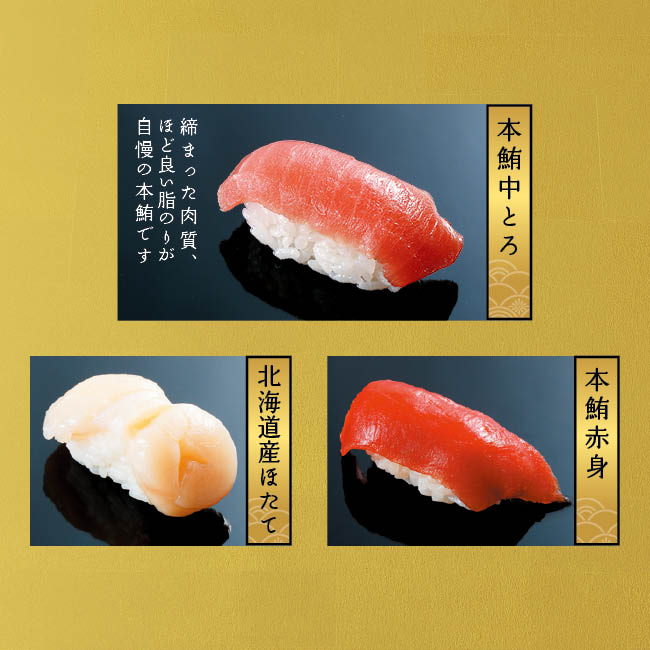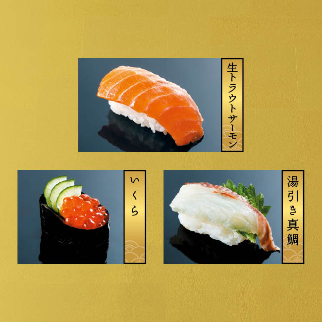 5人前 本鮪中とろ、本鮪赤身、北海道産ほたて、生トラウトサーモン、湯引き真鯛、いくら、バフンうに、穴子、ずわいがに トレーサイズ:353×353mm