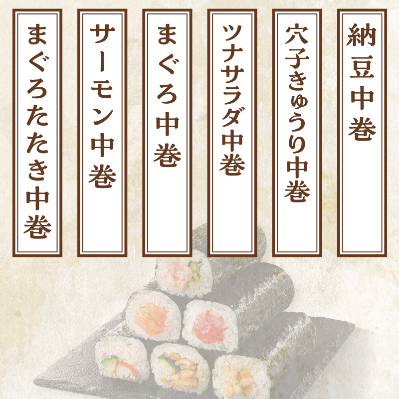 まぐろたたき中巻・サーモン中巻・まぐろ中巻・ツナサラダ中巻・穴子きゅうり中巻・納豆中巻