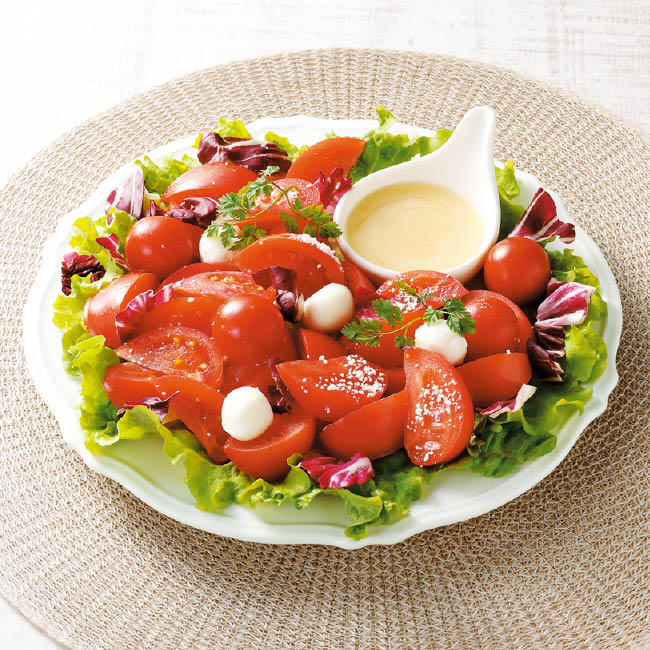 木熟トマトをたっぷり使用し、2種類のチーズをトッピングしました。相性の良い特製すりおろし玉葱ドレッシング付き。見た目も豪華に食卓に彩を添えるサラダです。