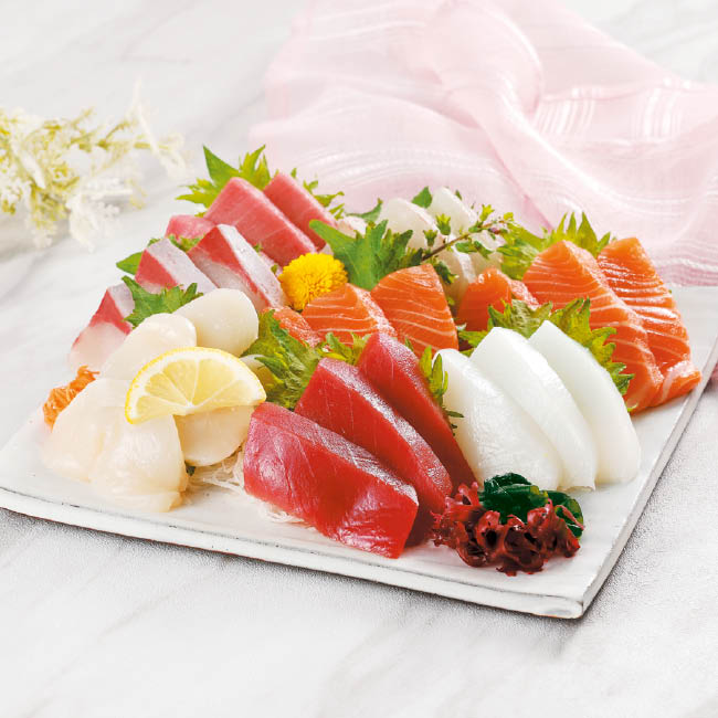 本まぐろ中とろ3切・真鯛3切・サーモン6切・いか3切・ぶり3切・ほたて3枚・本まぐろ赤身3切