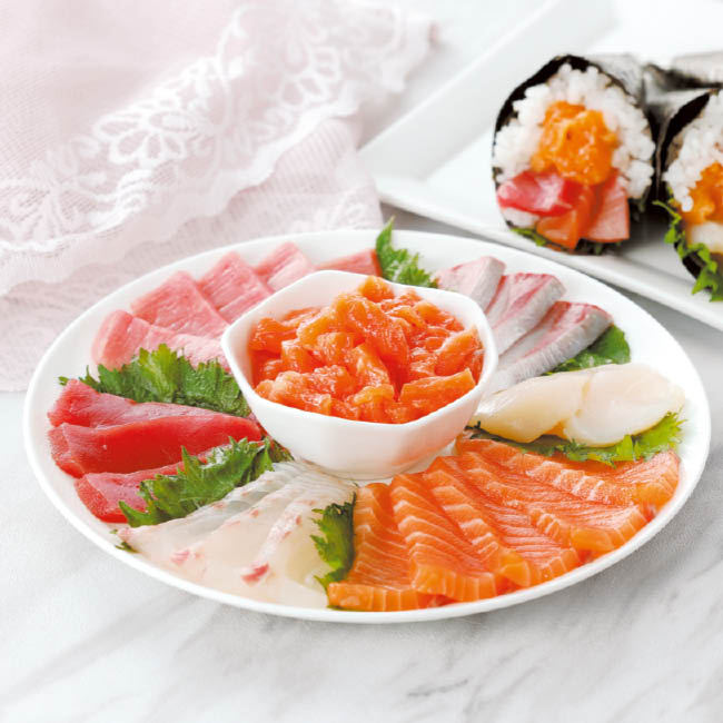本まぐろ中とろ6切・本まぐろ赤身4切・真鯛4切・ぶり4切・サーモン6切・ほたて4枚 寿司ネタサーモン100g ※寿司ネタのみのセットです。