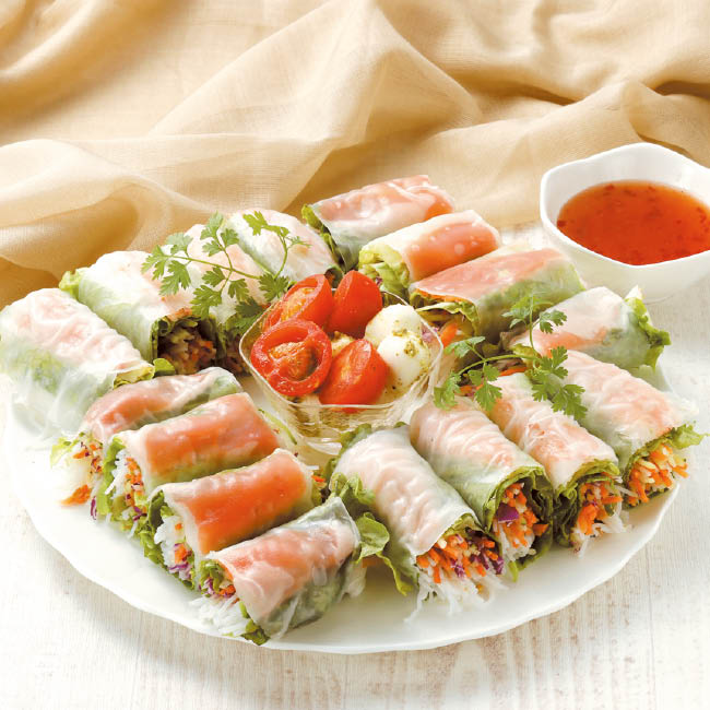 海老生春巻・サーモン生春巻・トマトカプレーゼ(バジルソース) トレーサイズ:250×250mm